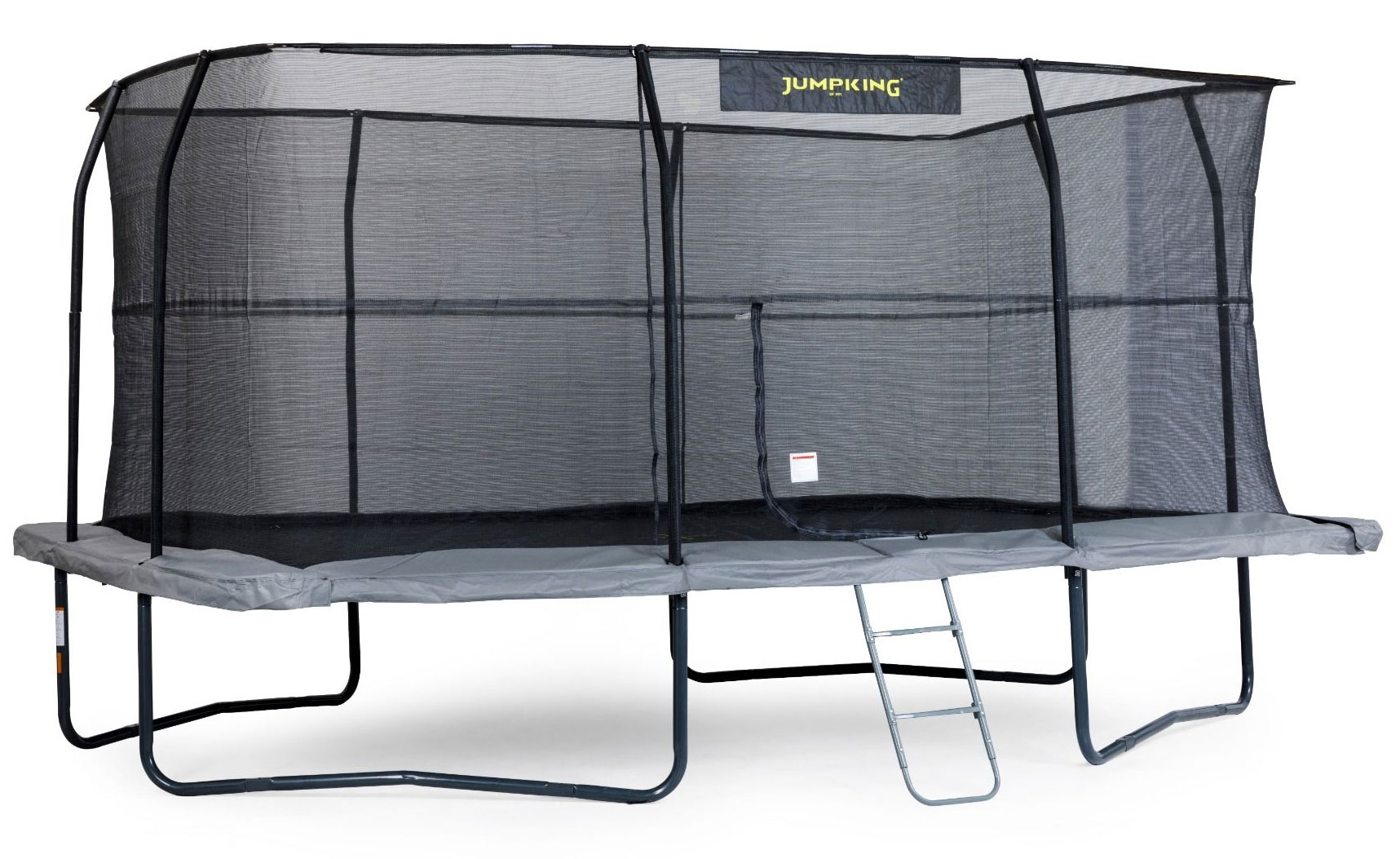 The JumpKing 11.5 ft x 16 ft Rectangular Combo Pro Trampoline with Accessories offers a premium rectangular jumping experience combined with added accessories for enhanced usability and value. Its large jumping surface is ideal for controlled bounce and performance. Features: Fully stitched-in enclosure for improved safety, with an elegant design for easy assembly and a secure fit. Horizontal quick-fit shock-corded rods provide a stable and reliable enclosure. Unique Tri-Layer socket system enhances durability and removes the need for brackets. Fully fastened entry/exit door for maximum safety. Strong grey powder-coated steel frame. Manufactured by JumpKing, a leading global trampoline brand. - Dimensions: 4.9 m x 3.5 m